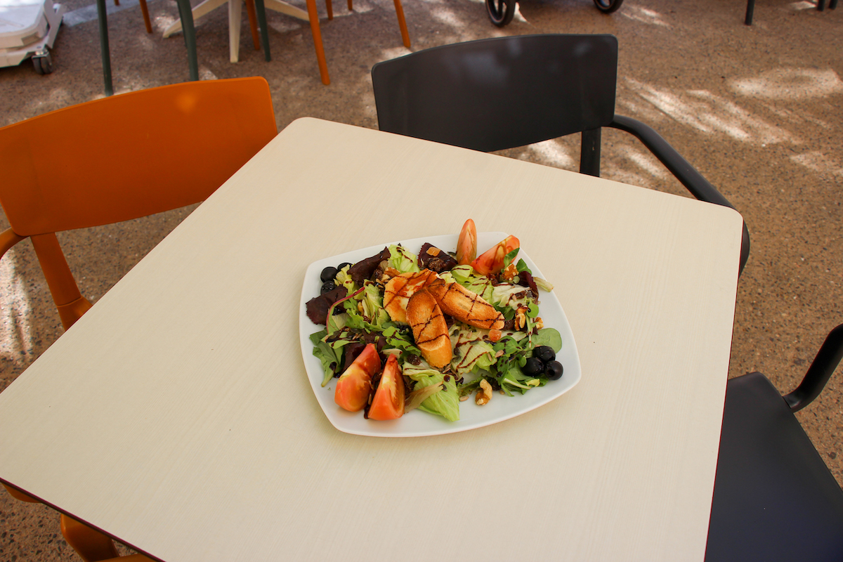 Enciam, tomàquet, albergínia, pebrot verd i formatge de cabra